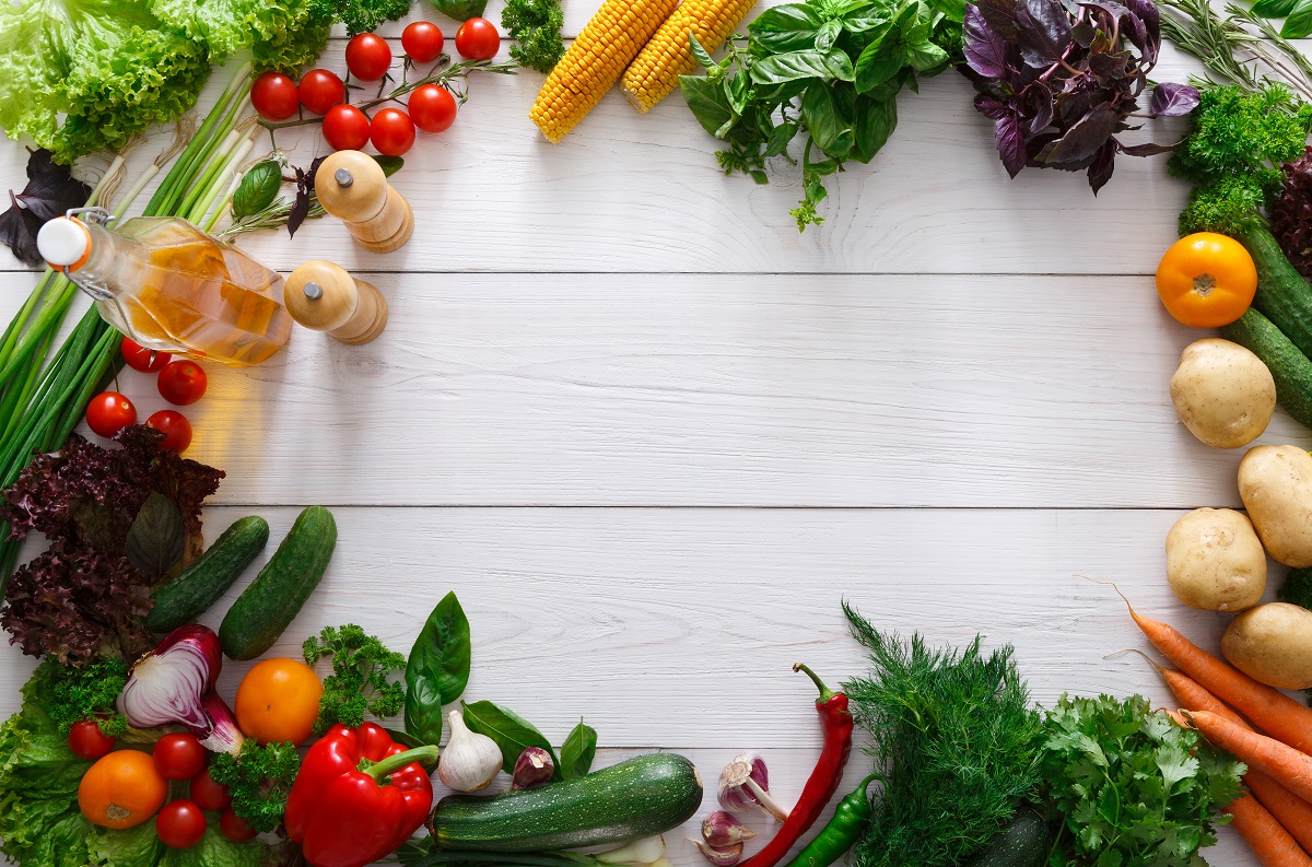 Fresh vegetables frame on white wooden background with copy space